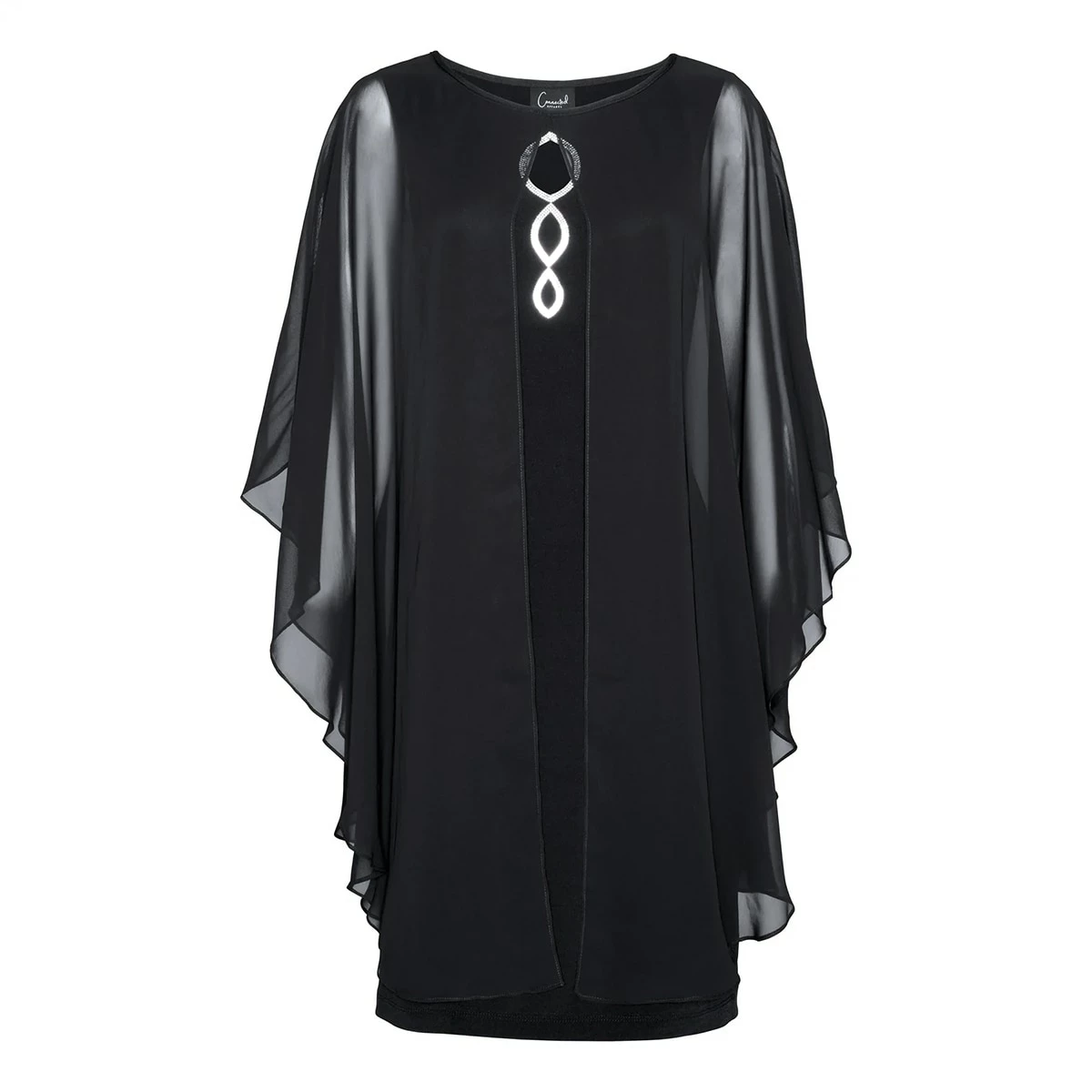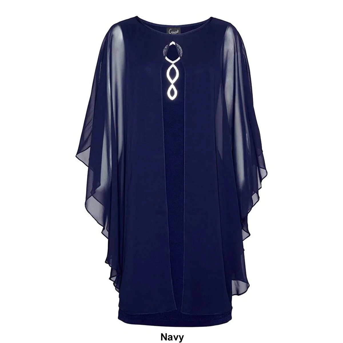 The Plus Size Connected Apparel chiffon cocktail dress features a silver sequin detail on the keyhole neckline and an attached cape and is sleeveless.