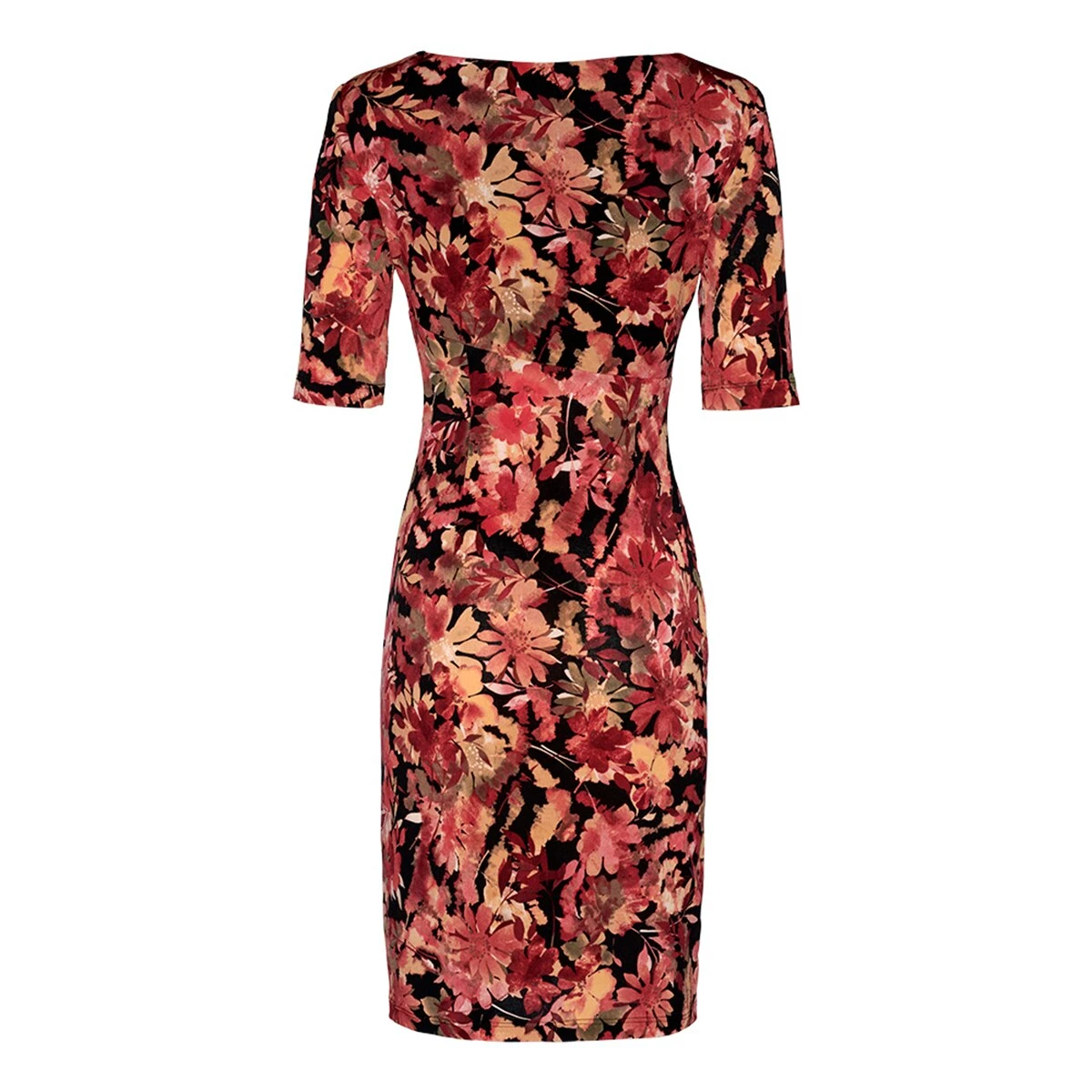 Enhanced with a flattering side ruched detail, this Plus Size Connected Apparel floral ity dress. Features a scoop neck and elbow sleeves.