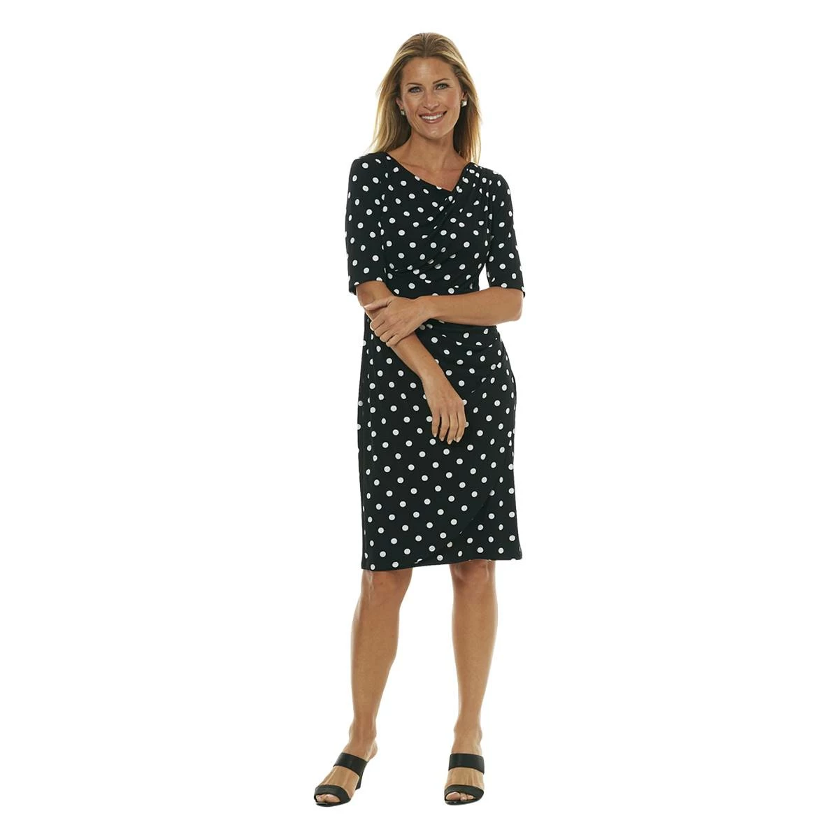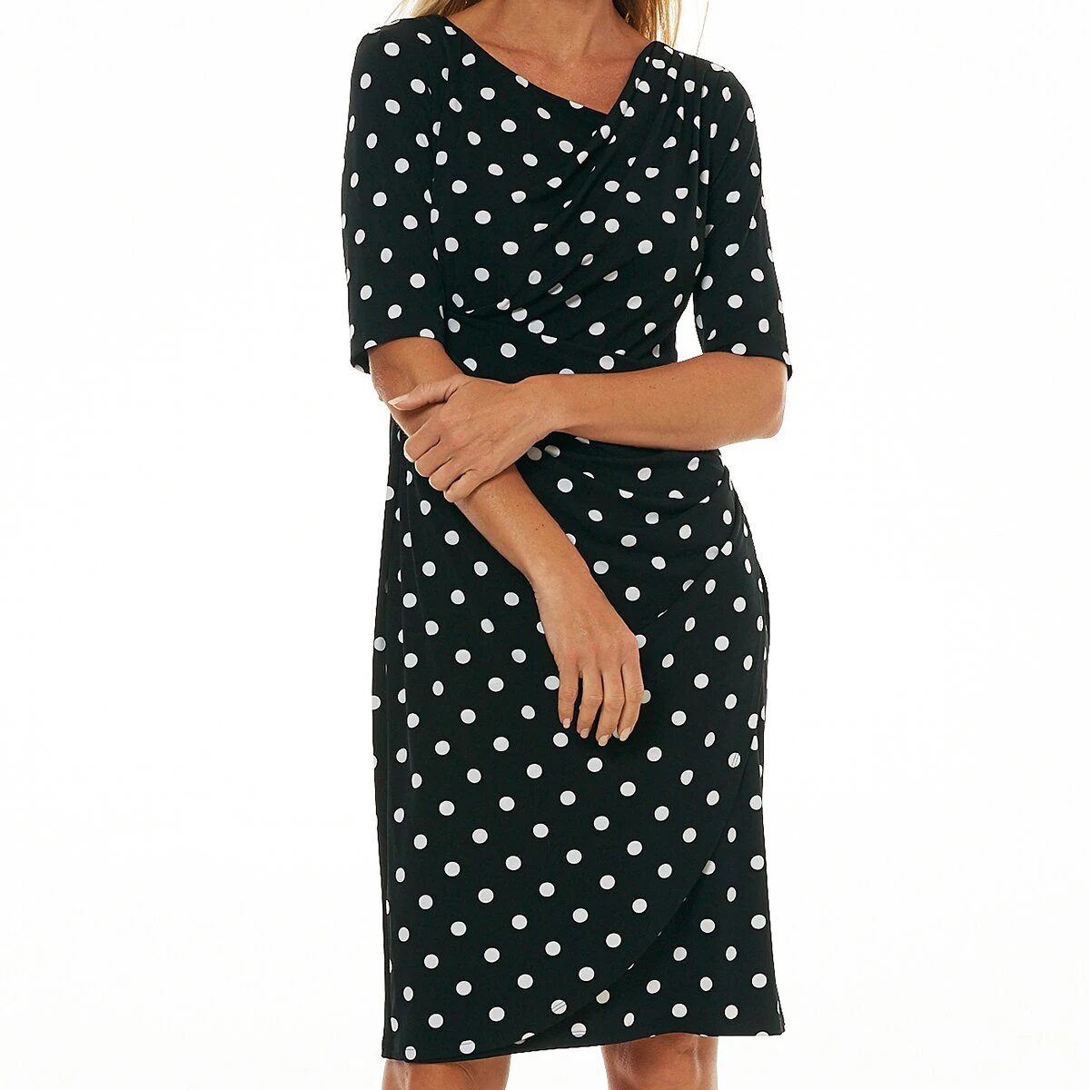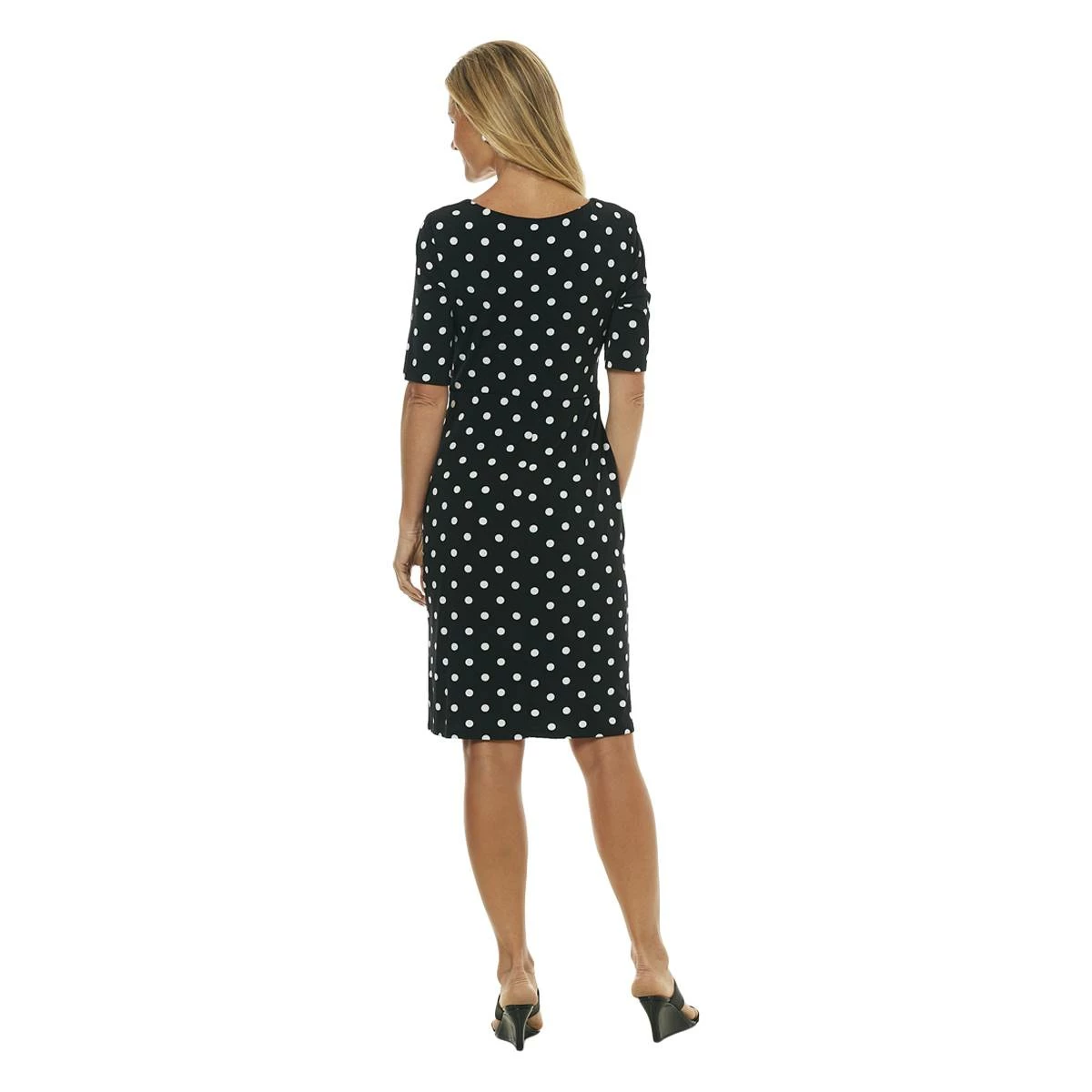 Update your style with this Womens Connected Apparel dot dress that features an asymmetrical v neckline and elbow sleeves. Wear this to any event or social gathering.