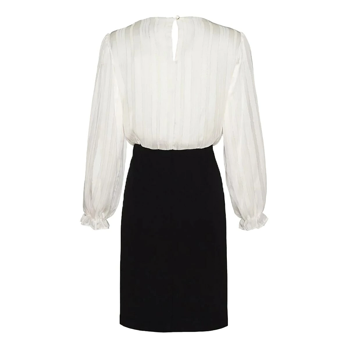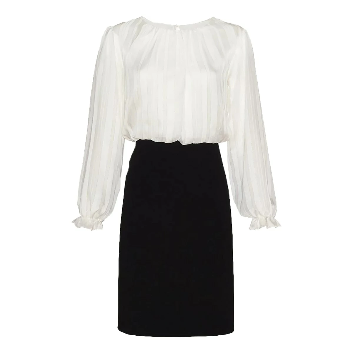 Simple and sophisticated this Womens Connected Apparel mock 2-piece dress features a boat neckline and long sleeves with elastic ruffle cuffs.