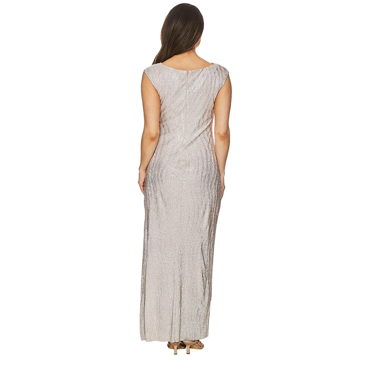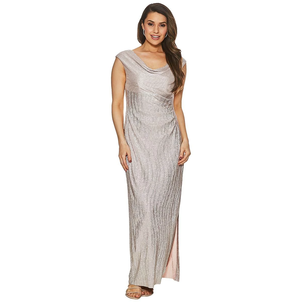 Elevated comfort at its finest by wearing this Womens Connected Apparel sleeveless foil knit gown. A draped cowl neck and gathered waistband create a definition on this figure-flattering dress. Wear this dress to special events this season and beyond.