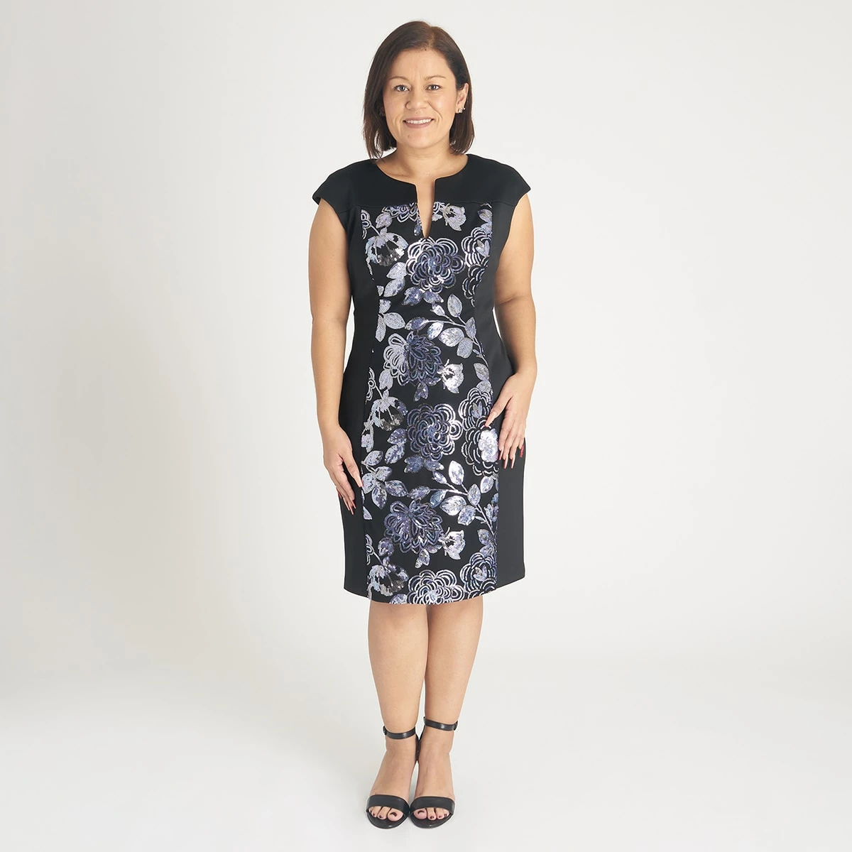 This Womens Connected Apparel sleeveless sequin sheath dress features a floral-embroidered panel, that runs from the notched neck to knee-length hem on this satiny sheath shaped to flaunt an hourglass figure.