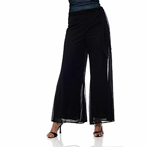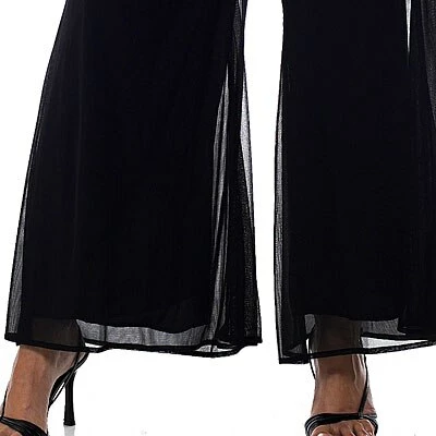 The solid Womens Connected Apparel palazzo pants are a sensational style. The wide leg bottoms include a pull-on feature, chiffon overlay, solid lining, and a chiffon belt attachment. 27 inch inseam. Overly & Lining: 100% Polyester. Hand wash. Dry flat.