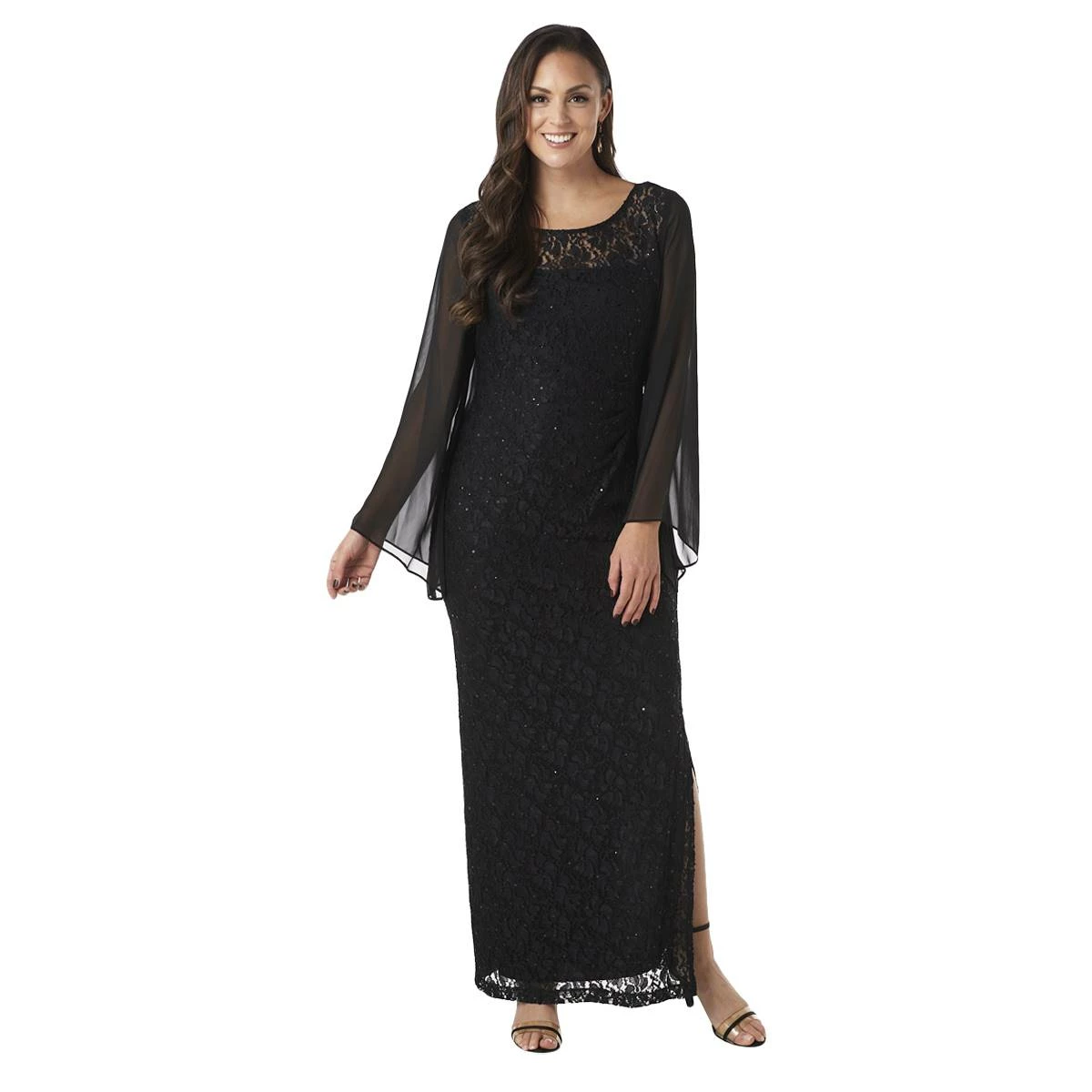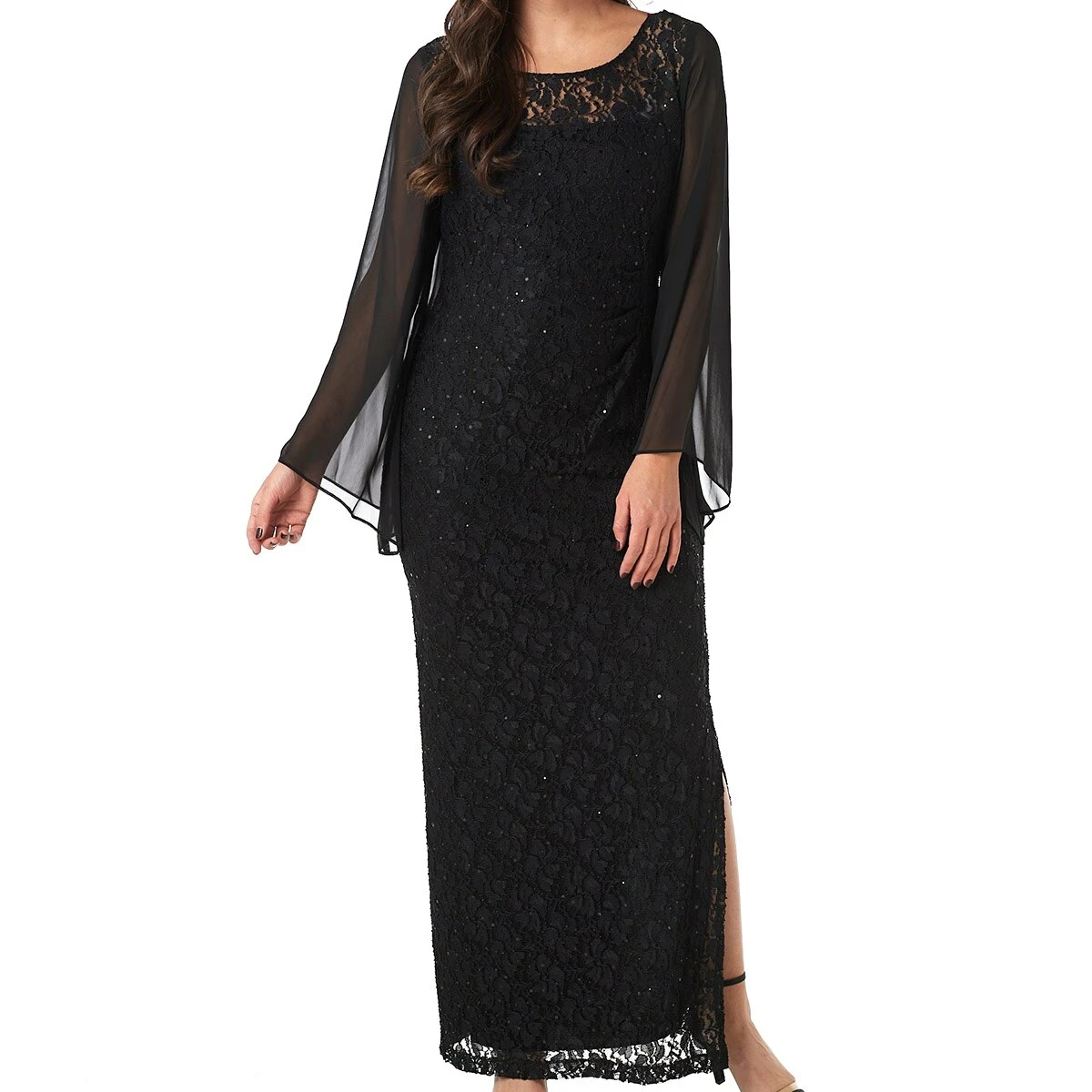 It’s hard not to turn heads wearing this Womens Connected Apparel wide sheer sleeve sequin lace dress.