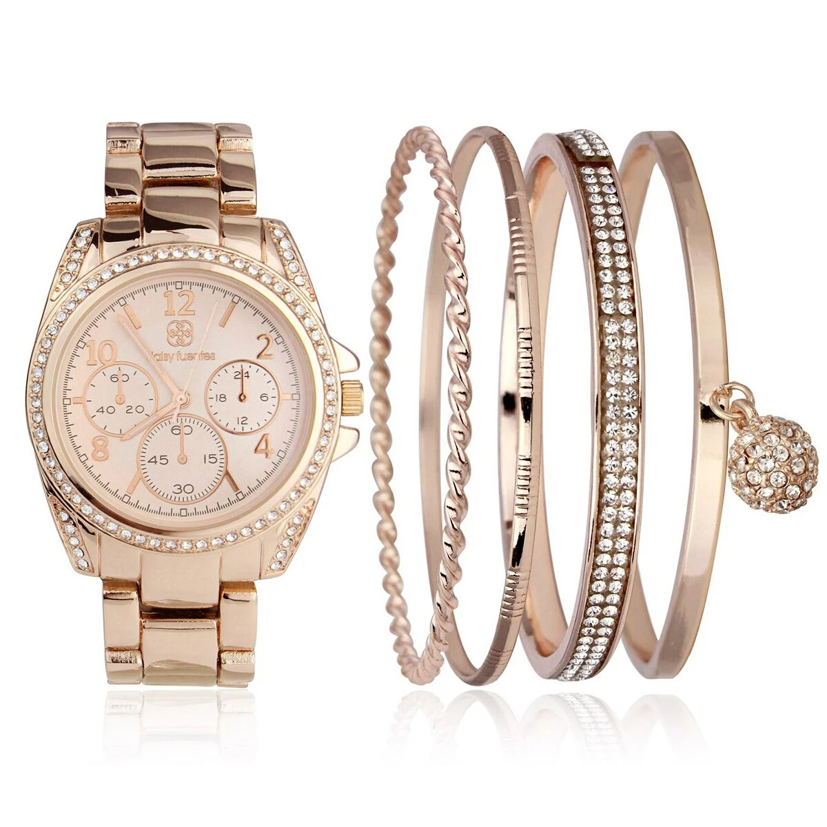 This Daisy Fuentes analog watch and bracelet set features a rose gold 40mm crystal case and a rose gold sunray dial on a rose gold metal band with a jewelry clasp closure.This set includes 4 distinct rose gold and crystal bracelets that extend the sparkling theme of the set.