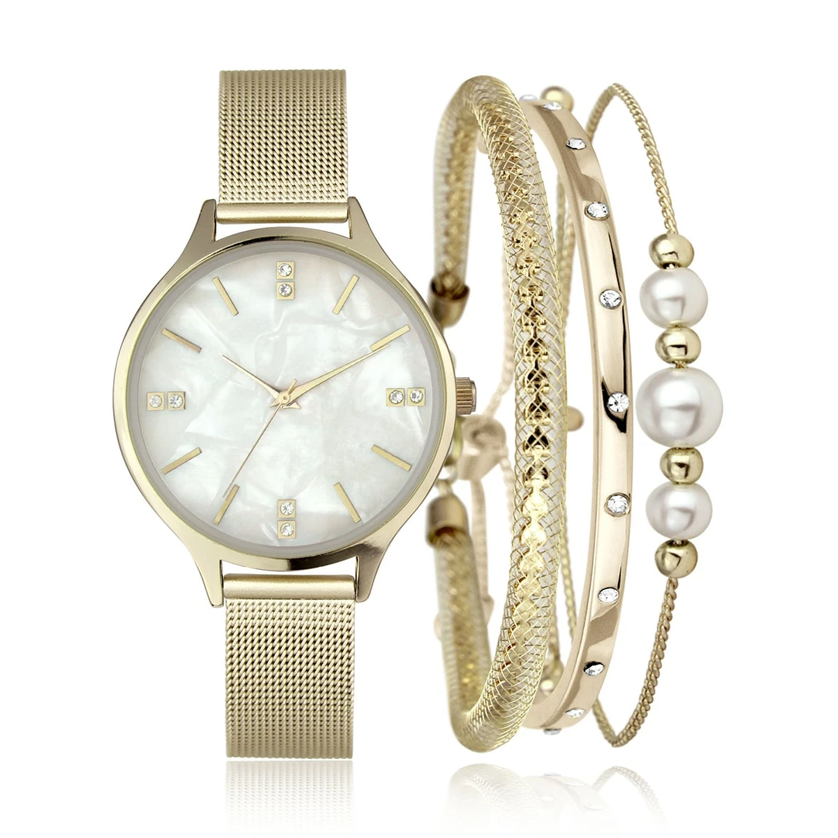 This Daisy Fuentes watch and bracelet set includes a metal gold mesh bracelet watch that features stone quarter-hour markers and crystal and pearl-adorned bracelets.