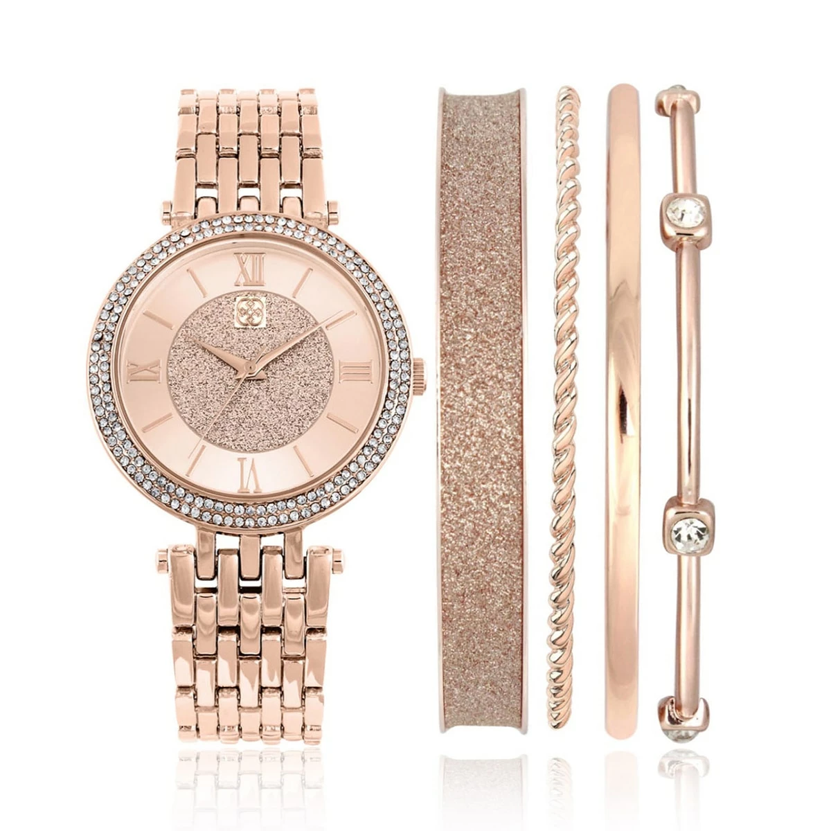 This Daisy Fuentes watch and bracelet set includes a metal rose gold band watch that features a 40mm sparkling gold double row crystal-encrusted bezel with glitter rose gold dial.This set includes 4 distinct bracelets that extend the sparkling theme of the set.