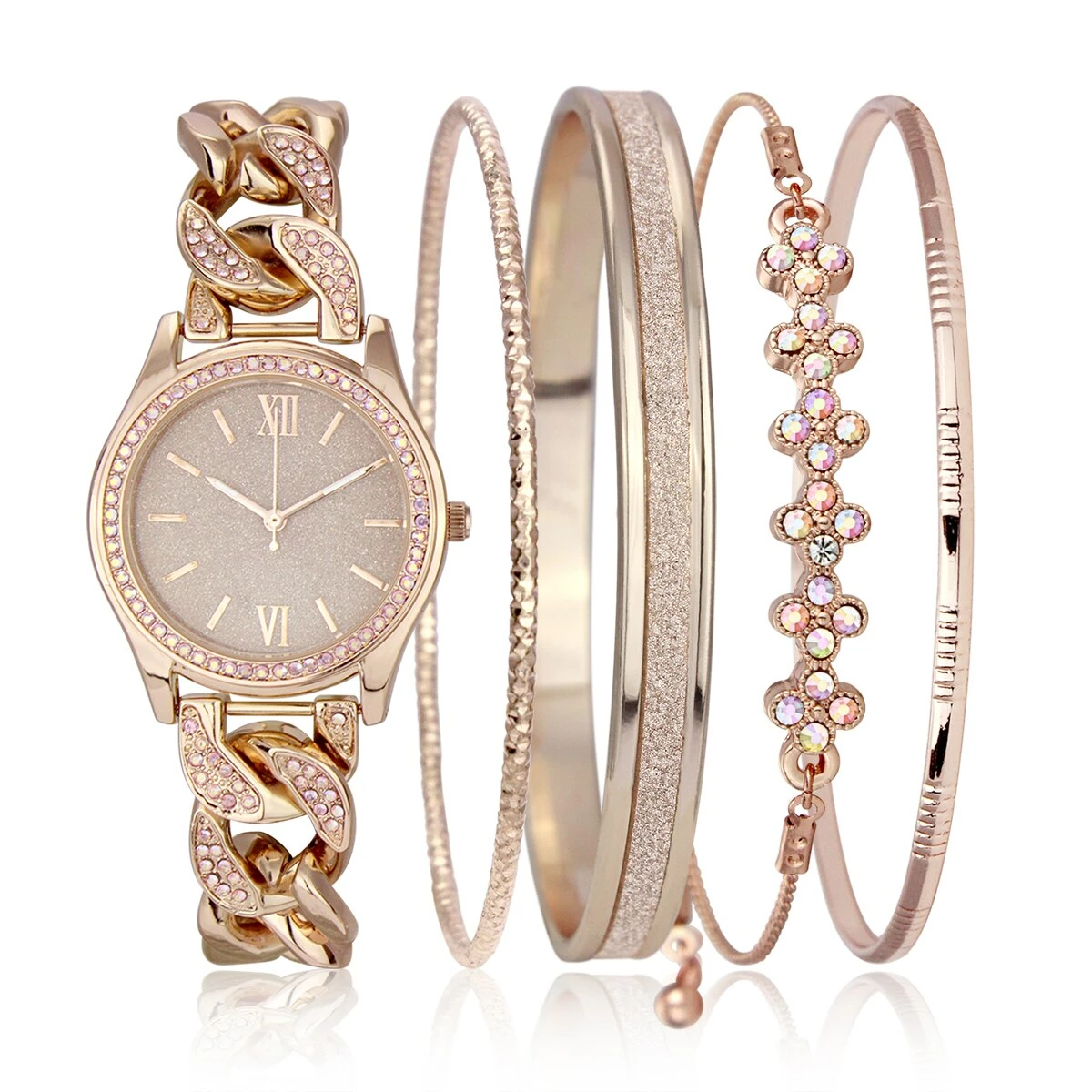 This Daisy Fuentes watch and bracelet set includes a metal rose gold crystal-adorned chain link band watch that features a 35mm sparkling rose gold crystal-encrusted bezel with a glitter rose gold dial.This set includes 4 distinct bracelets that extend the sparkling theme of the set.