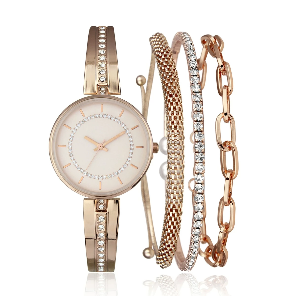 This Daisy Fuentes watch and bracelet set includes a metal rose gold bracelet watch that features stones on the bracelet and watch dial.