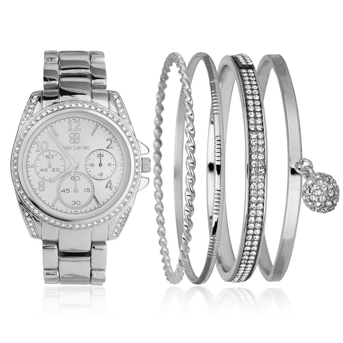 This Daisy Fuentes silver analog watch and bracelet set includes a watch that features a silver 40mm crystal case and a silver sunray dial on a silver metal band with a jewelry clasp closure.This set includes 4 distinct silver and crystal bracelets that extend the sparkling theme of the set.