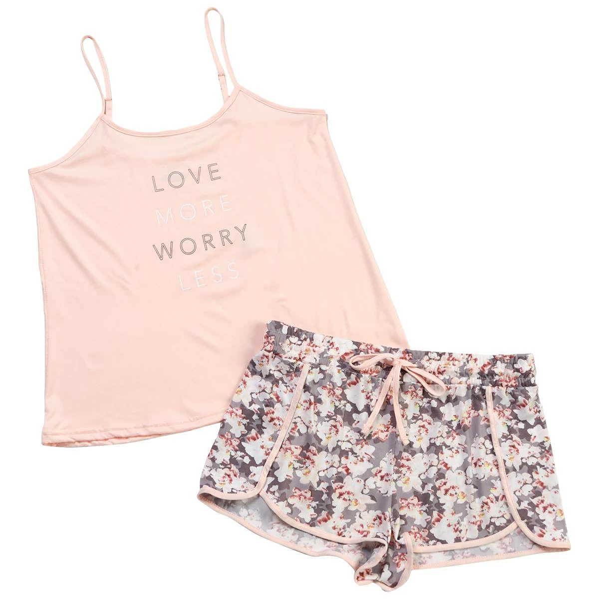 Lightweight and soft, the Womens Danskin Love cami and boxers pajama set is a great set to relax around your house in. Providing a tank with a “LOVE MORE WORRY LESS” screen printed on the front and floral pajama shorts with tie front closure.
